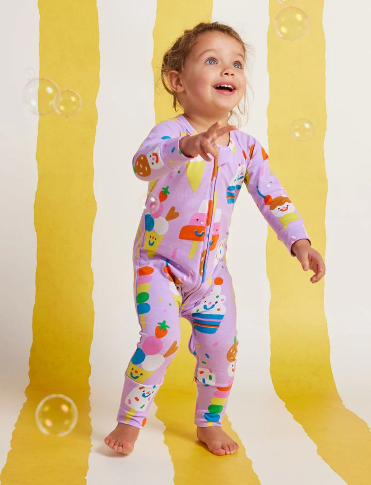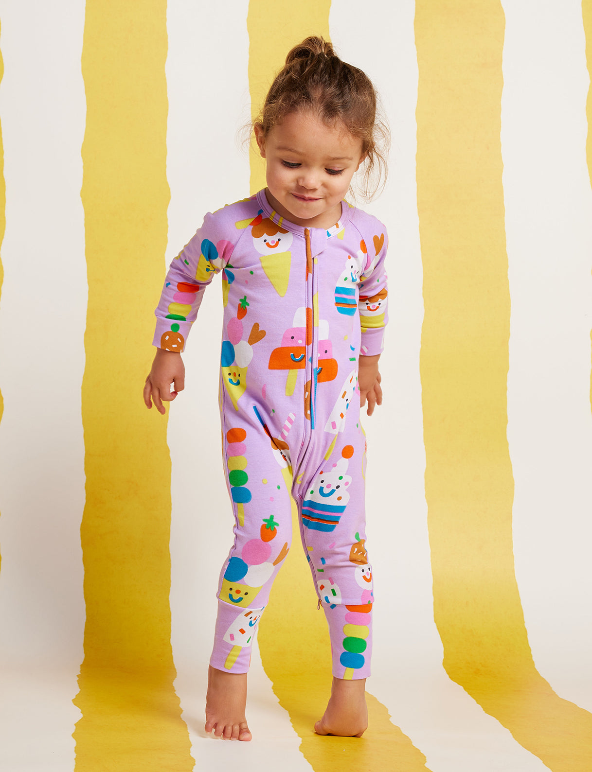 A full body suit with zip closure for babies, designed by Halcyon Nights, Australia. The fabric used is 95% cotton and 5% elastane, and features illustrations by Susie Hammer.