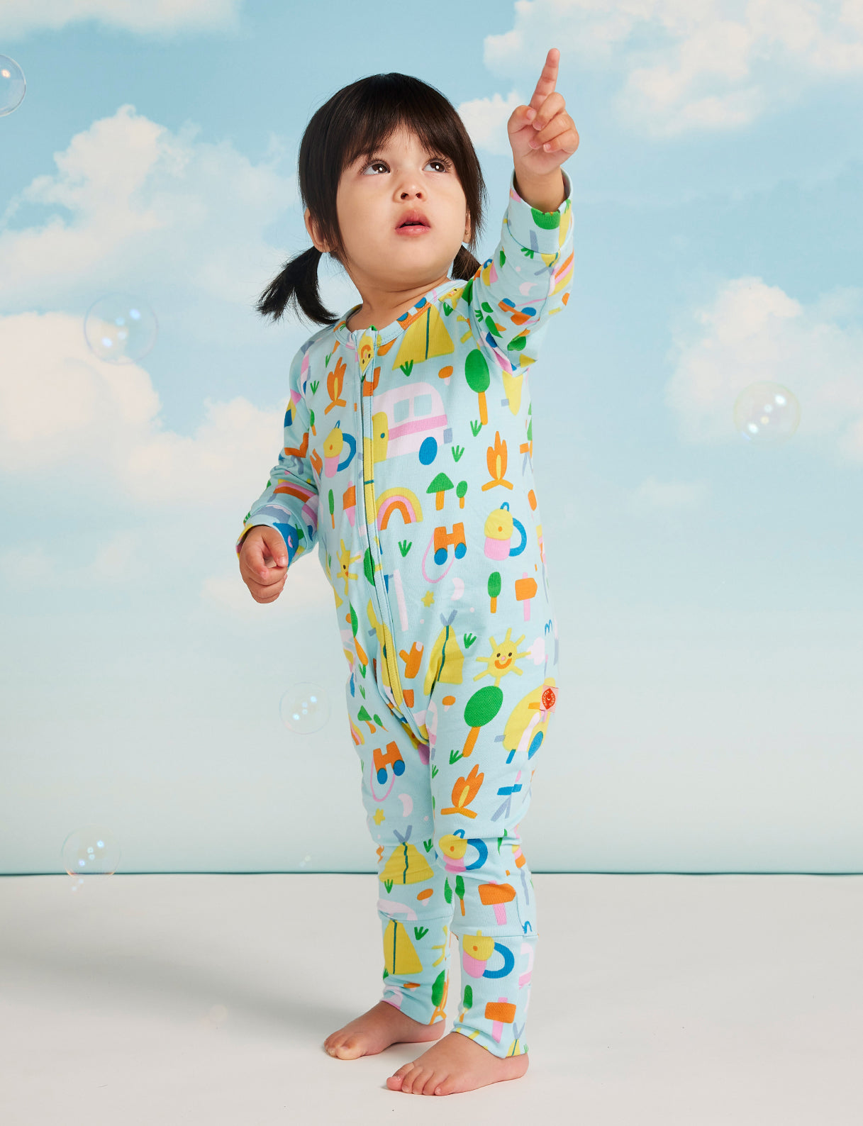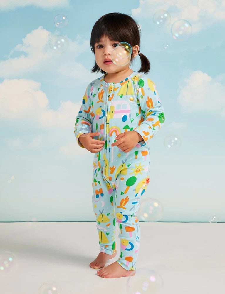 A full body suit with zip closure for babies, designed by Halcyon Nights, Australia. The fabric used is 95% cotton and 5% elastane, and features illustrations by Susie Hammer.