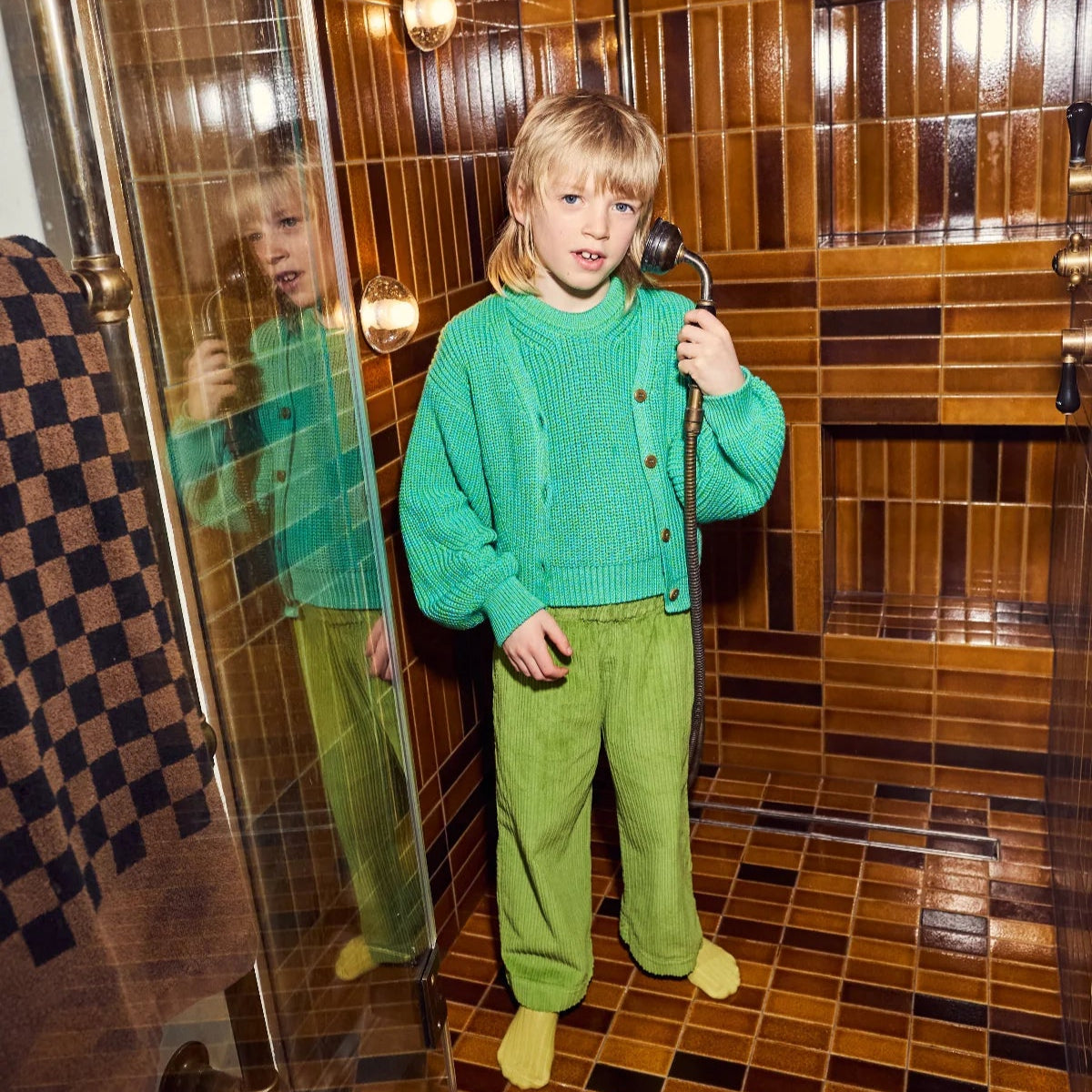 Relaxed, boxy fit vest that works on it's own or layered over t-shirts and shirts. Knitted with organic cotton yarns in turquoise and green, which have been twisted to create a mélange effect. Designed by Studio Koter, UK and produced ethically in Türkiye. Also available in adults sizes.