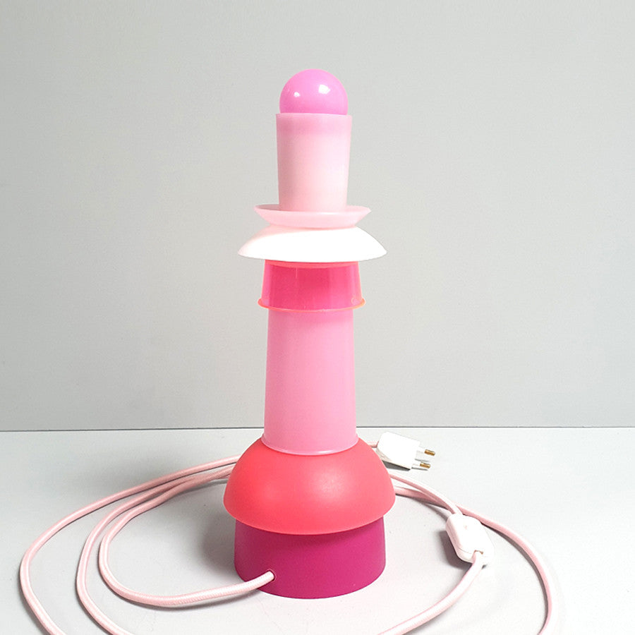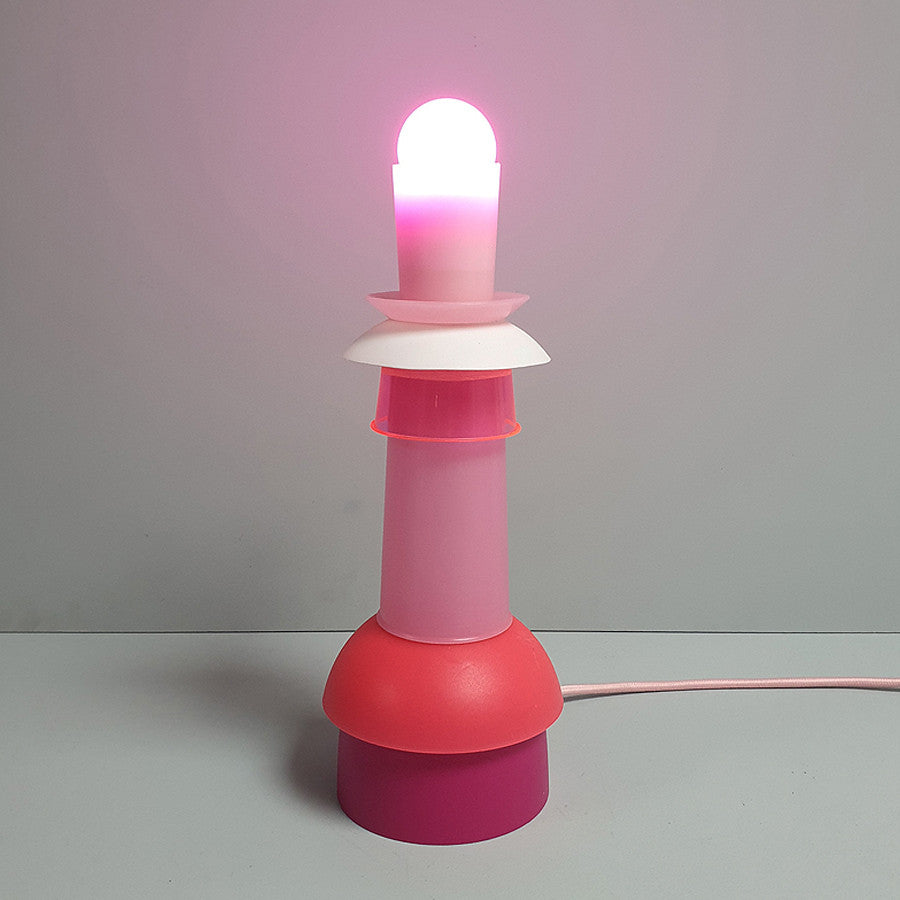 A totem table lamp designed by Kriz NL, constructed from upcycled Tupperware parts. Measuring 34cm in height and 12cm at the widest point, this lamp is completely unique. A matching colour power cable with on/off switch and plug are attached, measuring 150cm long. Alternative designs available.