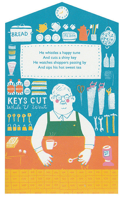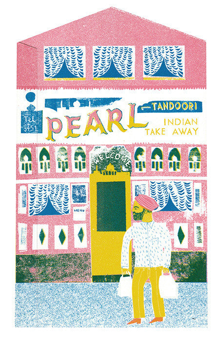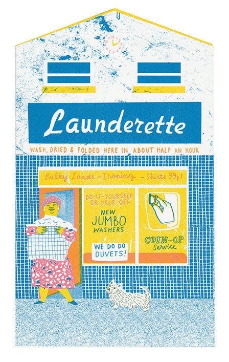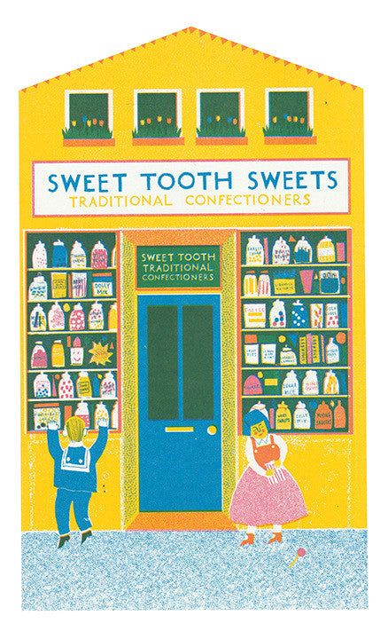 A concertina book, with 10 double sided panels illustrated by Louise Lockhart UK. Measuring 14cm x 24cm when closed, and 139cm when fully open. An outside and inside view of 10 shops. Lithograph printed and published in the UK by Design for Today. Limited Edition.