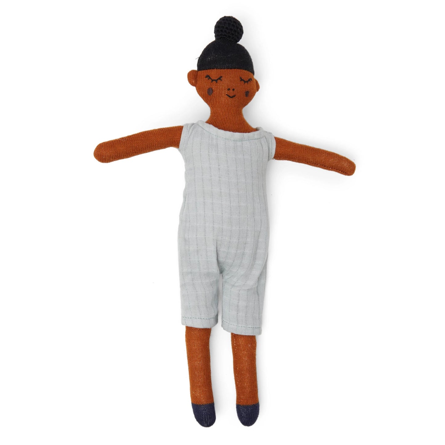 A soft knitted doll made from 100% cotton with biodegradable filling. Designed by Sophie Home, UK. Clothing is re-moveable and everything is washable and safe for babies from birth. Measuring approx. 30cm tall with arm span of 21cm. Alternative designs available.