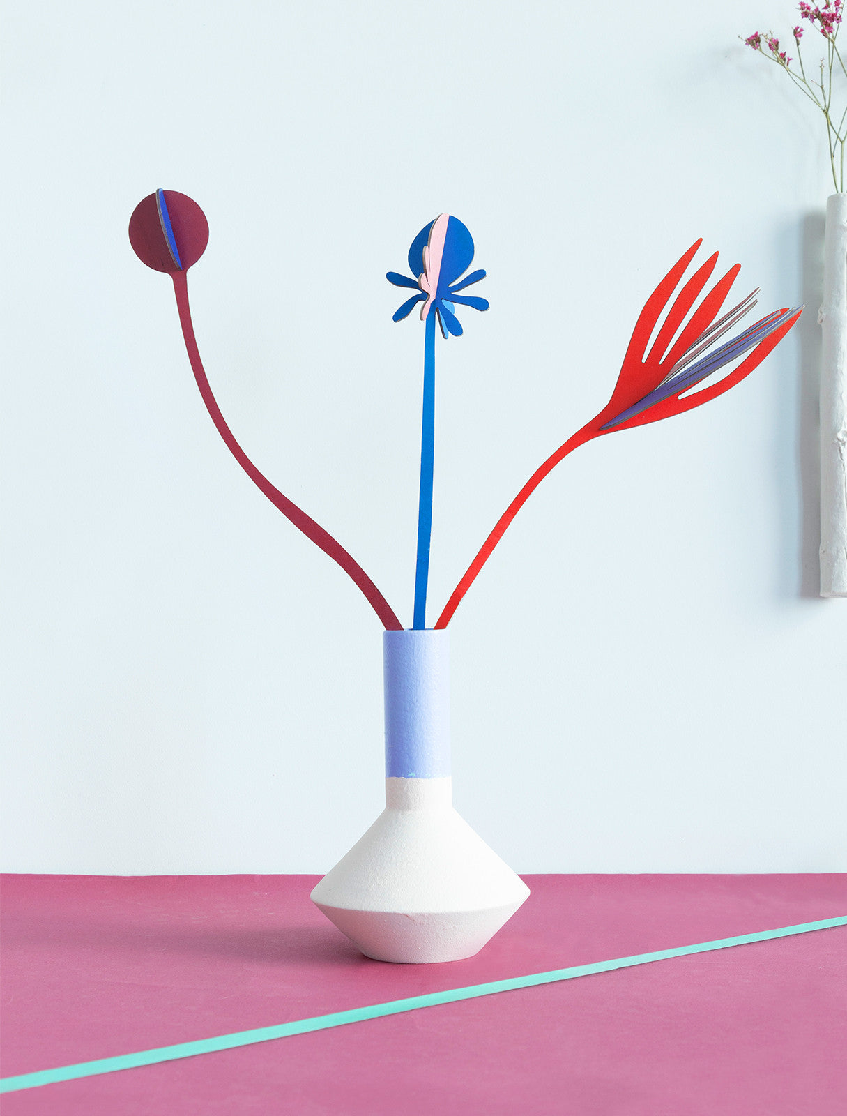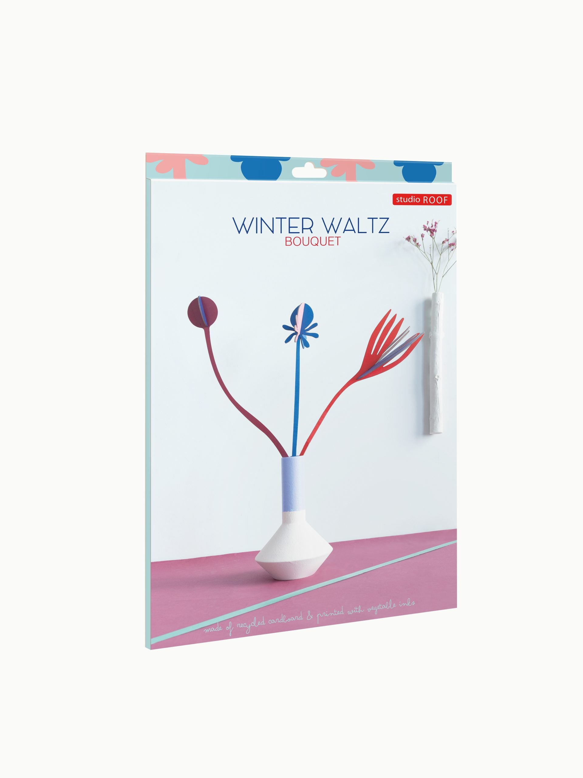 A set of 3 self-assembly flowers made from recycled cardboard printed with vegetable inks. Designed by Jantien Baas for Studio Roof NL, each flower measures approx. 8 x 8 x 27 cm when assembled. The set comes flat packed, 1 x A4 sheet with 6 pop-out motifs, clear instructions, all inside a cardboard wallet. Alternative designs available.
