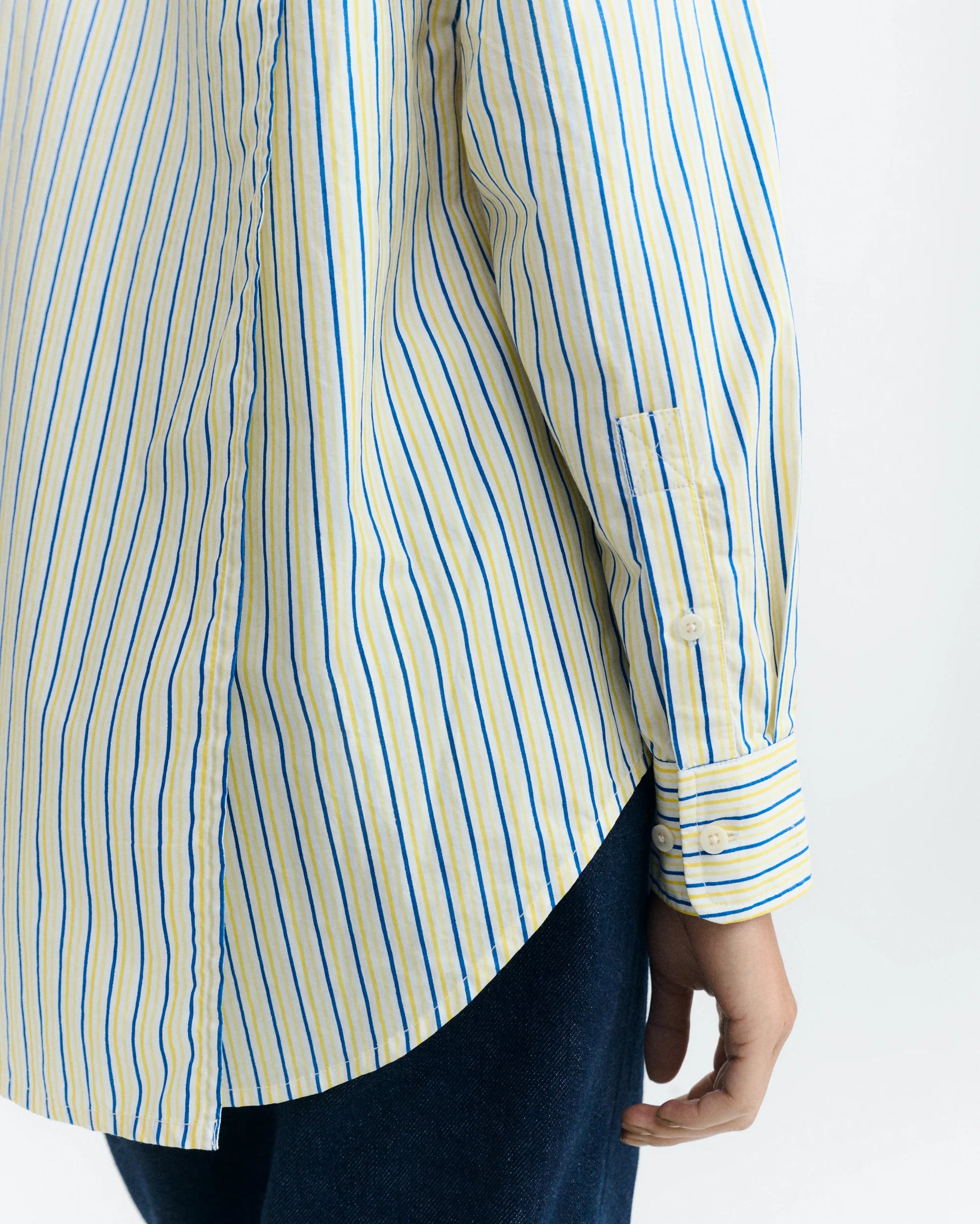 An oversized yellow and blue striped shirt made of organic cotton, designed by Thinking Mu, Spain.
