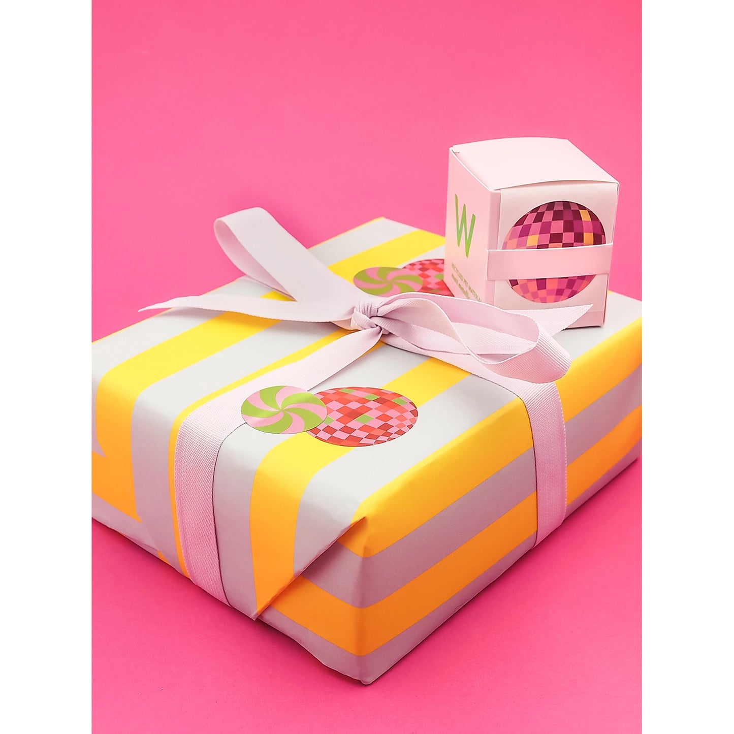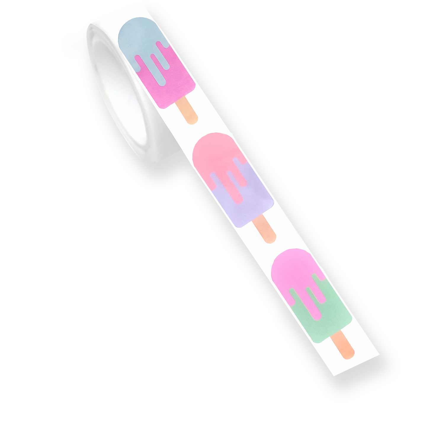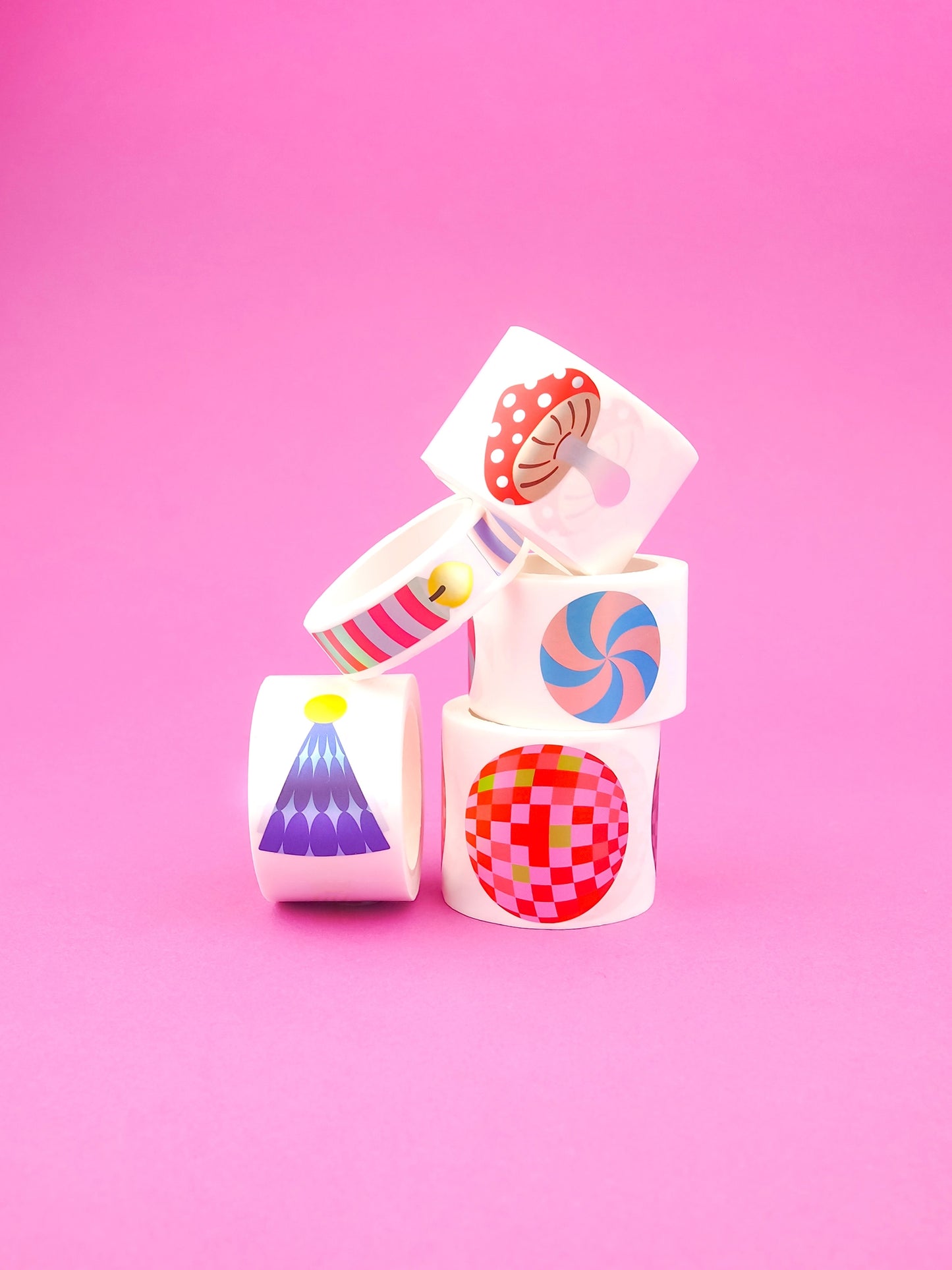 A roll of 100 shiny stickers, packaged in a cardboard box dispenser. Made from a recycled plastic bottle material, and measuring 1.5cm x 4.5cm diameter. Alternative designs available.